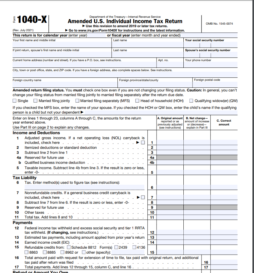 The original amount is displayed in Column A of the 1040X; 0 (zero) is displayed in Column B; the original amount is displayed in Column C.