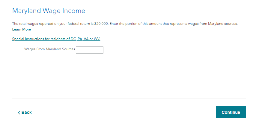 If you are a West Virginia resident, regardless of time spent in Maryland, you should enter 0 (zero) as your Wages From Maryland Sources. You are exempt from Maryland tax on all of your Maryland wage and salary income, even if you earned the income from services performed in Maryland.