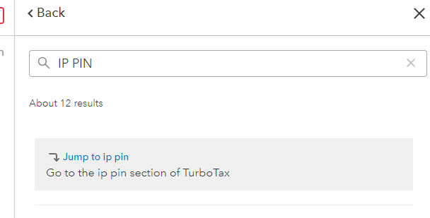 To enter the IP PIN, go to the search bar and enter "IP PIN" without quotes. See below. Then click jump to.