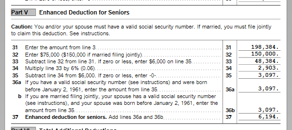 The phase-out amount for the Senior Deduction is 150K for MFJ. Check the calculations on Schedule 1-A, Part V.