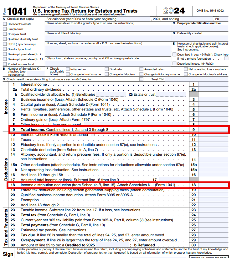 The estate form will reduce taxable income by the distribution. If they are receiving the full distribution, there is no taxable income to the estate.