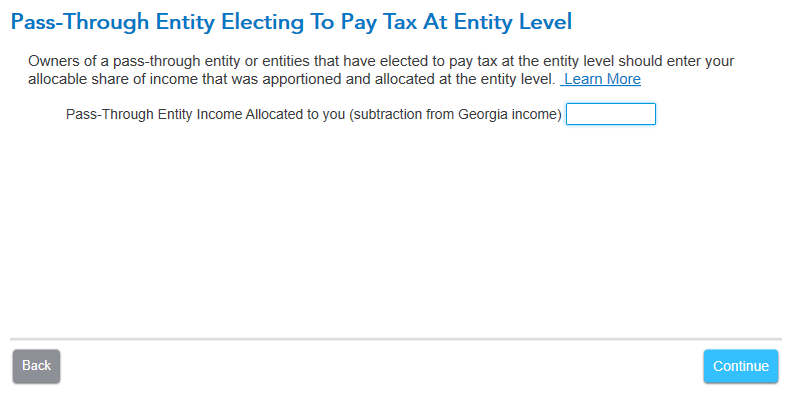 Entry to Schedule 1 may be found in the Georgia state income tax return, at the screen Pass-Through Entity Electing To Pay Tax At Entity Level.