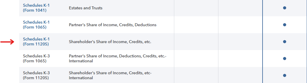 This comparison shows that TurboTax Online Premium will file Schedule K-1 income from an 1120S tax return. Scroll down the left side to view.