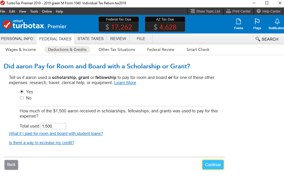 After entering your 1098-T, Continue to a screen asking if you paid for Room and Board with a Scholarship or Grant (screenshot).