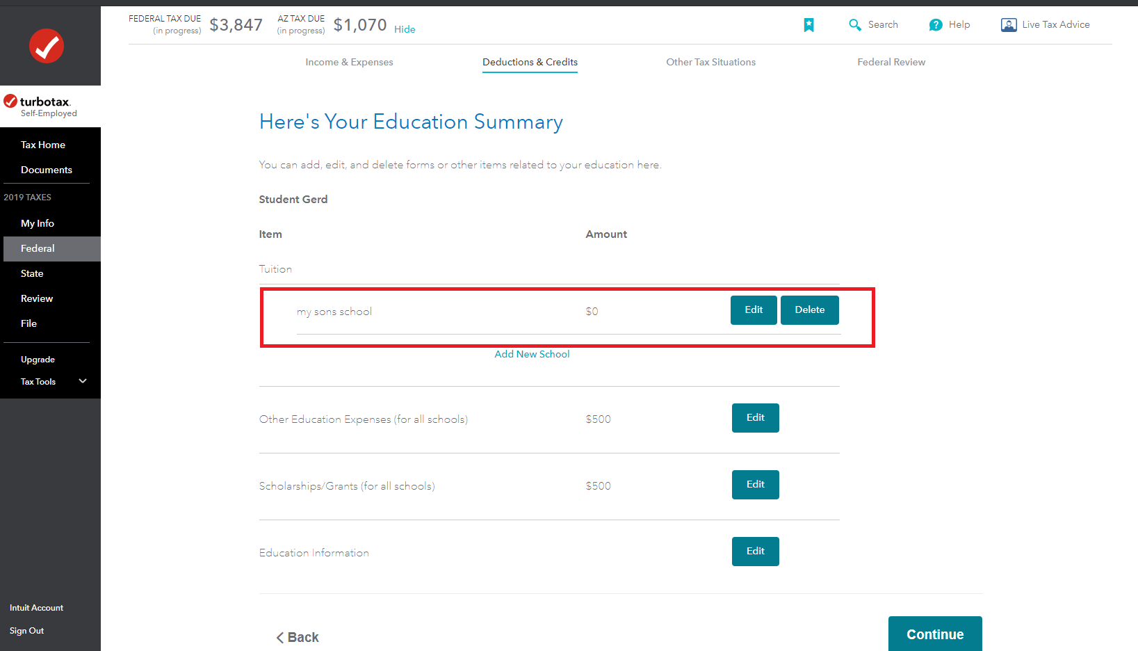 If you have already entered the 1098-T, Continue to 'Education Expenses Summary' (screenshot).