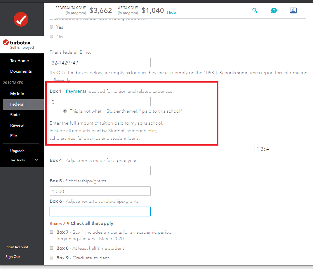 For example, I will override the 1098-T box 1 in Turbo Tax to the tuition amounts for both semesters ( which is 1098-T $7K plus $8K not showing on 1098-T till 2020) Then I will put the room and board expenses I paid for BOTH semesters under the Educational Expenses, correct? Then next year 2020 when I receive the new 1098-T, I need to subtract what I had claimed $8K, correct? Thanks.