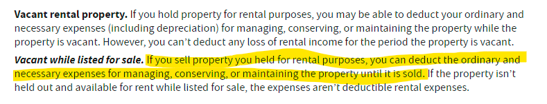 There have been numerous discussions in TurboTax about this issue for the past few years. The general con-census is that if the property is for rent and for sale, then the expenses can be deducted as rental expenses.