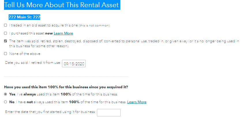 Basically, when working through an asset you select the option for "I stopped using this asset in 2020" and go from there. Note that you MUST do this for EACH AND EVERY asset listed.