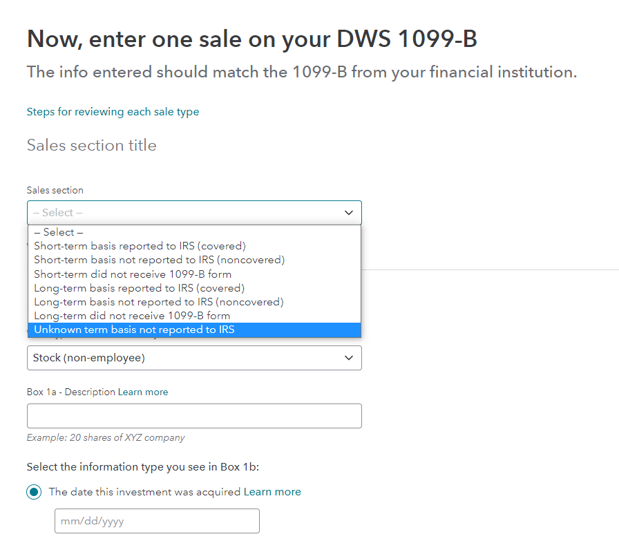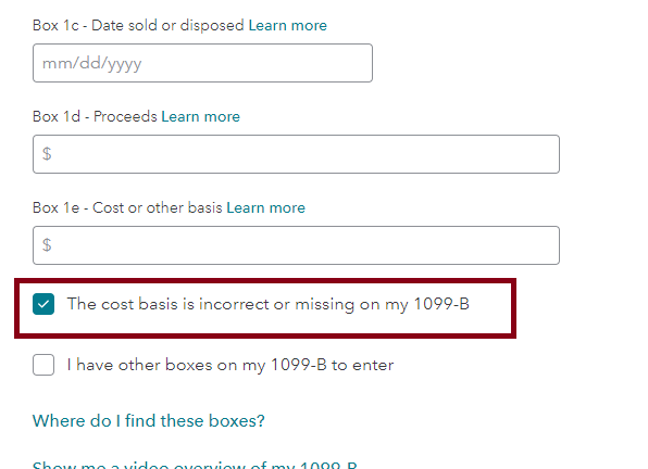 Leave the cost basis blank, but select. The cost basis is incorrect or missing on the 1099-B.