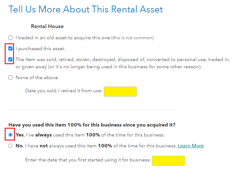 Report the sale under your rental asset. Under Wages & Income select your Rental Income > Edit > Continue to the screen 'Tell Us More About This Rental Asset'. Select that you purchased it, also the item was sold, retired, ...., etc. > Yes always used 100% for business.