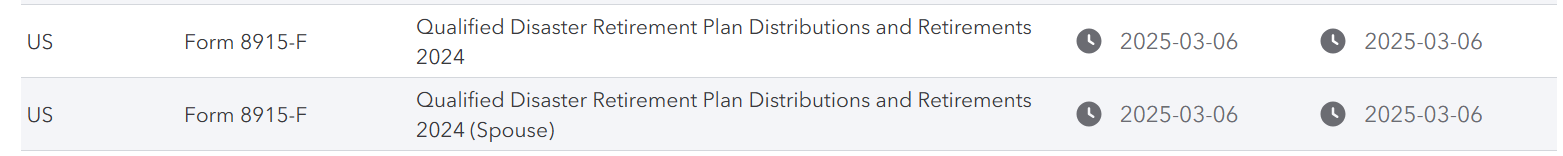 If this is about the 2024 Qualified Disaster Retirement Plan Distributions, this should be available at the end of the week. Please see When will my individual tax forms be available in TurboTax? for details.