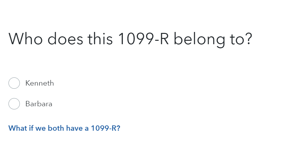 In TurboTax Online, when entering each form 1099-R, there is a page titled Who does this 1099-R belongs to?.