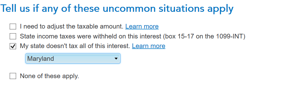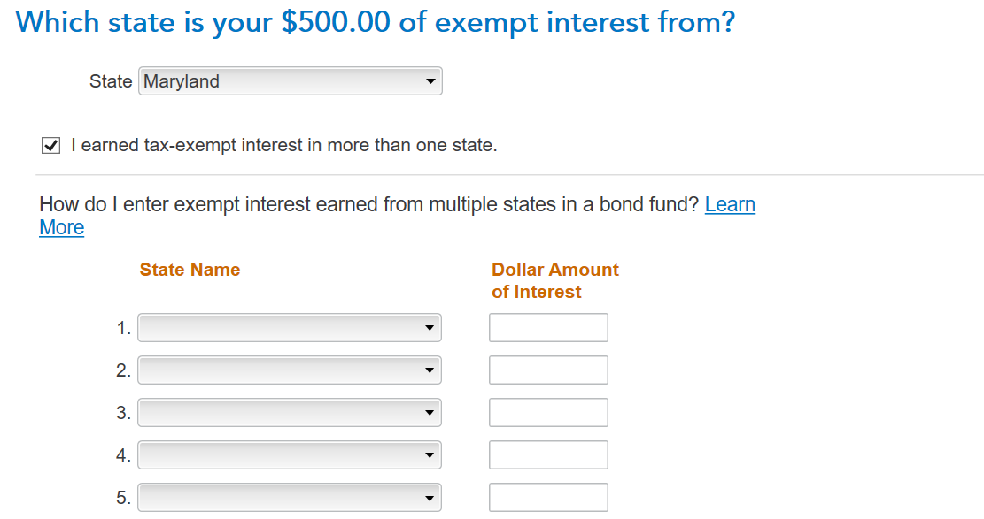 If the interest was earned in the state you are filing for, then you need to enter that state and the interest applicable to that state to have it be exempt. You will see a screen that says Which state is the tax-exempt interest from after you enter your Form 1099-INT. Below the box where you enter your state, you need to check the box that says I earned tax-exempt interest in more that one state. Then you will see a list where you can enter several states: