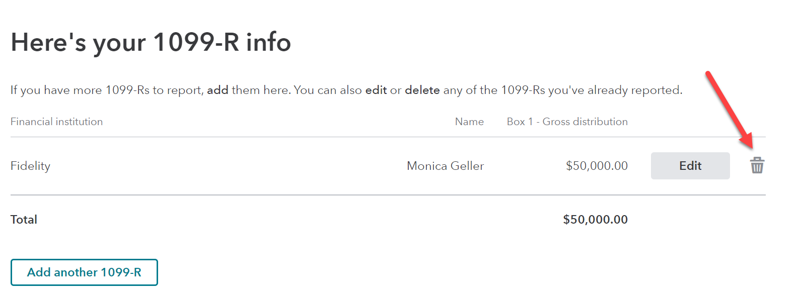 You will need to delete the 1099-R that is causing the problem. Here is how to find it: