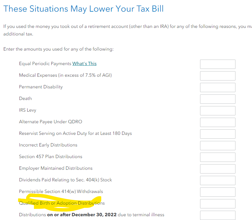 Enter your 1099-R exactly as it appears. After you enter all of your 1099-R forms, you will be asked follow-up questions about those distributions. It is in the follow-up questions where you will indicate the exception. Distributions up to $5,000 per child for qualified birth or adoption expenses will not incur the 10% penalty. IRS exceptions to tax on early distributions