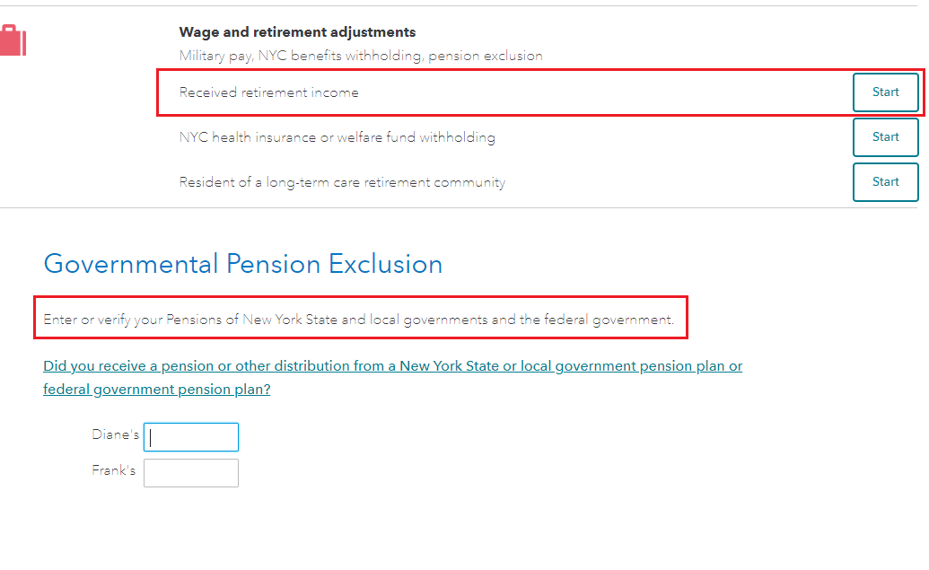I got thru your item 3 but item 4 (Gov't Pension Exclusion). What did show was "NY taxable..." where I filled in the amount. A few screens later I got to "Pension Deduction Summary" and low and behold my $20,000 showed up under NY non-disability pensions and IRA distr. That shows $69,860 and I have no idea where that comes from. May be correct but sure would like to have seen that amount listed somewhere else.