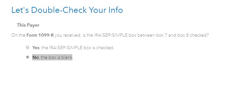 Do you mean the question about the "The IRA/SEP/SIMPLE box is checked on my copy of the 1099-R" between boxes 7 and 8? There should be an option "No, the box is blank".