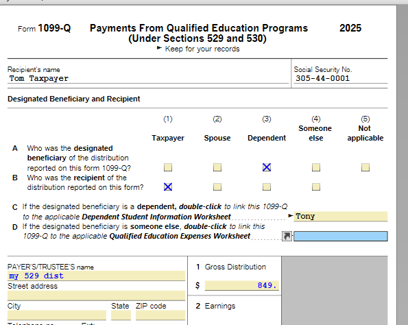 When viewing the 1099-Q in FORMS, do you have 'Dependent' checked as Beneficiary, and 'Taxpayer' checked as Recipient in A and B?  If you don't have 'someone else' checked for either of these, there should be no worksheet created.