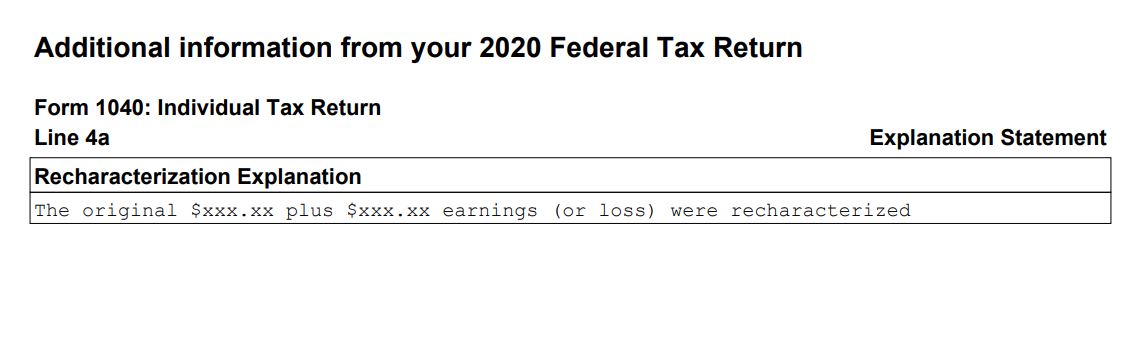 "TurboTax will ask for an explanation statement where it should be stated that the original $xxx.xx plus $xxx.xx earnings (or loss) were recharacterized."
