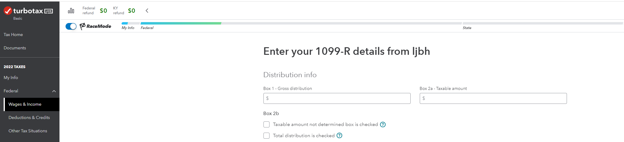 Seems to be working fine, this is a 1099-R you received correct? If you clarify which form you are putting in, and if it is in the correct place for income? 1099-R's are usually retirement distributions like 401(k), annuities, pensions, among others. The program seems to work both online and in the software, see below.
