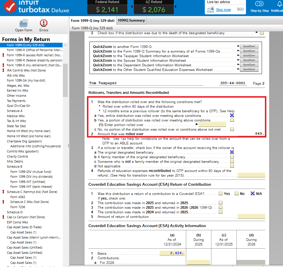 I guess my situation is slightly different than the original post; I rolled funds over directly from a Coverdell ESA to a 529 account. Therefore form 8606 does not apply. I selected the box confirming that this was a direct rollover, and TurboTax is still saying I owe a ton of taxes now as a result of this 1099-Q I am trying to enter.