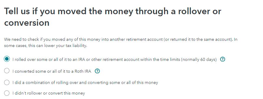 To indicate a ROLLOVER, you must enter the information after your enter the 1099-R in the income section. (see below) You will indicate the rollover amount and TurboTax will report it on your tax return. DO NOT enter in the Deductions & Credits section.