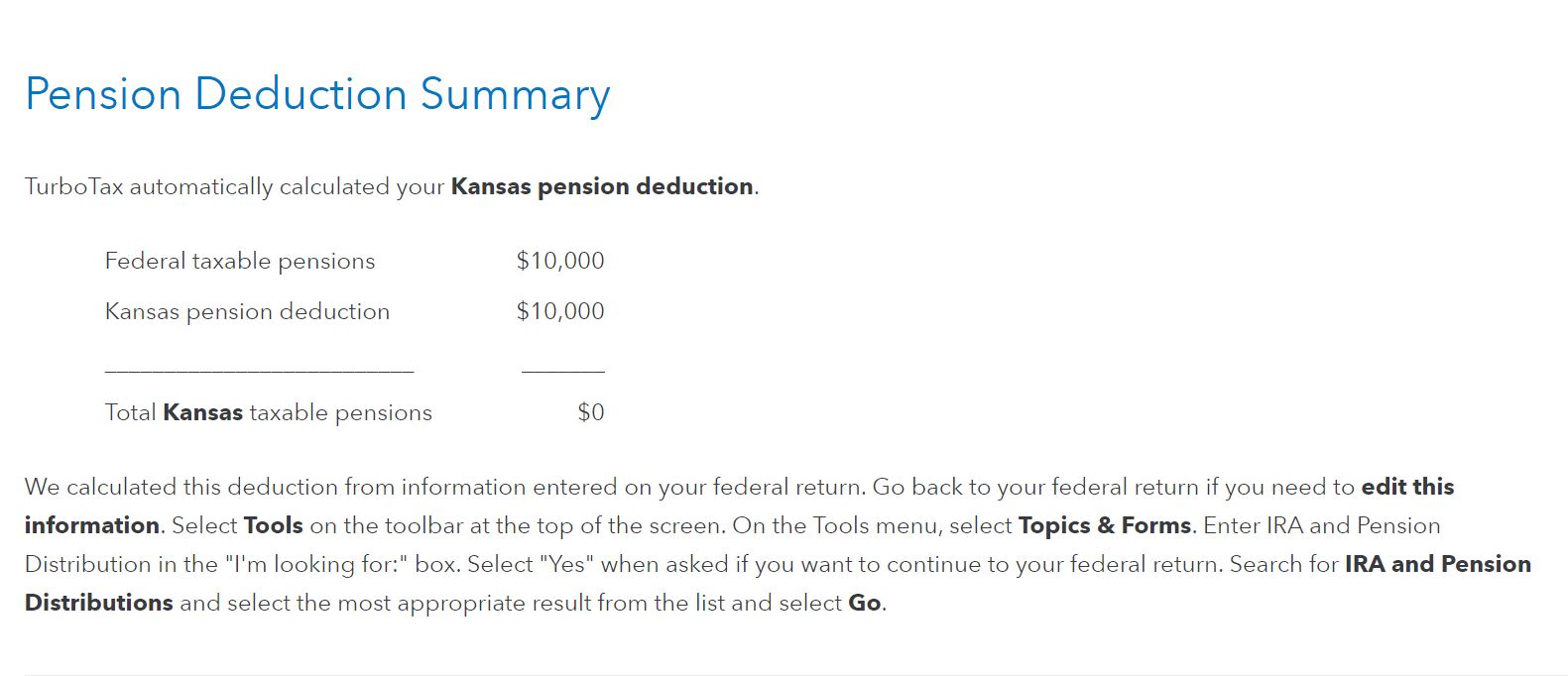 I just completed my Kansas state return in TurboTax Online, and I had the exact same issue. I entered my federal pension income correctly on my federal return (i.e., entered as CSA 1099R), but the Kansas state return did not subtract this amount. As a result, I'm going to have to file an amended Kansas return.