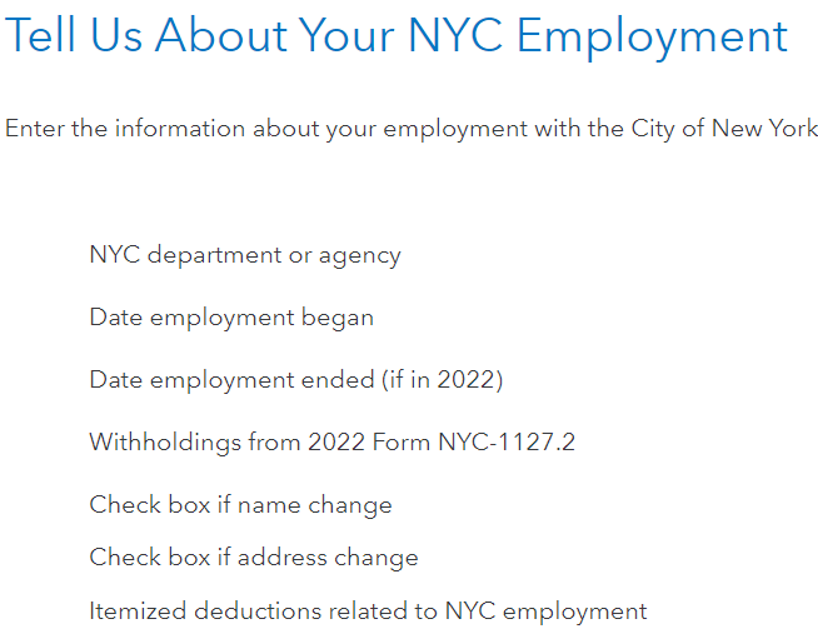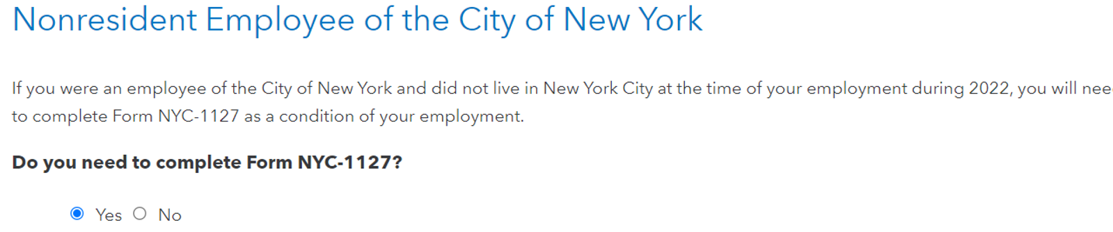 You can fill out an NYC-1127 on TurboTax but it is available to print only. E-filing the NYC 1127 is not supported. Manually enter the allocation for NYC and print and mail the NYC-1127. The form became available for printing on January 26, 2023.