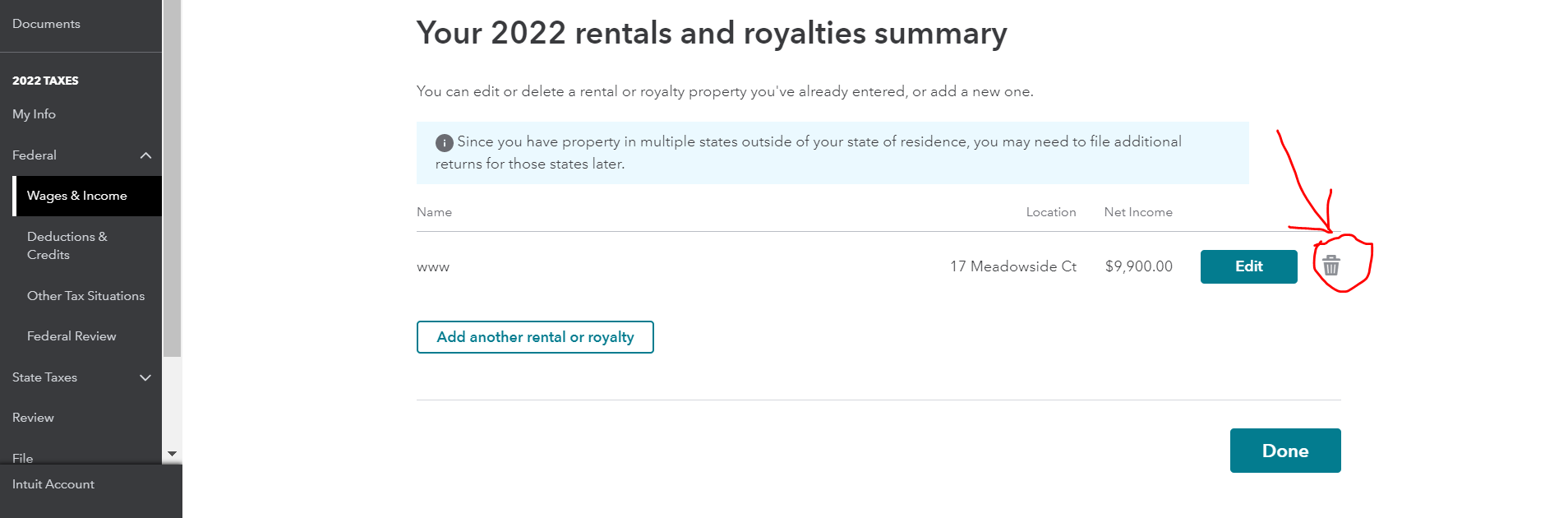 For some reason, Turbotax seems to think I need an empty Schedule E on my state taxes even though I have no rental property. If I go to forms view and delete it, it comes right back. I've been through every form and can't find anything that would seem to trigger this behavior.