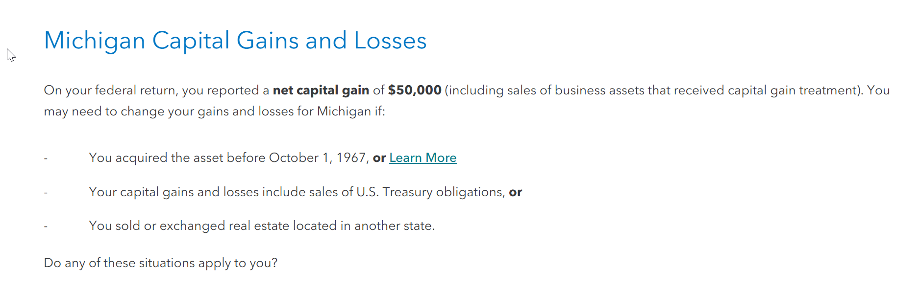 Thanks, but those questions did not apply to my situation. The MI state return is only showing our IRA deductions and pension payments. The gains and dividends are not included.
