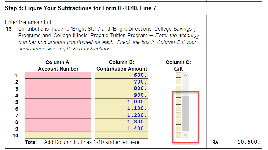 THERE IS NO SLIDER BAR!!! If there is a way to access it, please tell me how. I entered the deduction for four consecutive accounts on line 10, and the Illinois Department of Revenue has billed me for extra taxes.