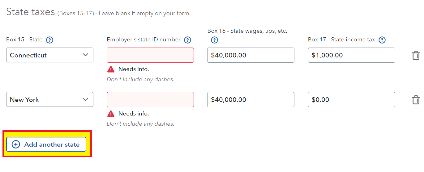 No, do not remove your New Jersey (NJ) wages from your W-2 during entry. Enter the W-2 exactly as it appears with two state wage amounts and the correct withholding for each state by selecting 'Add another state', as shown below.
