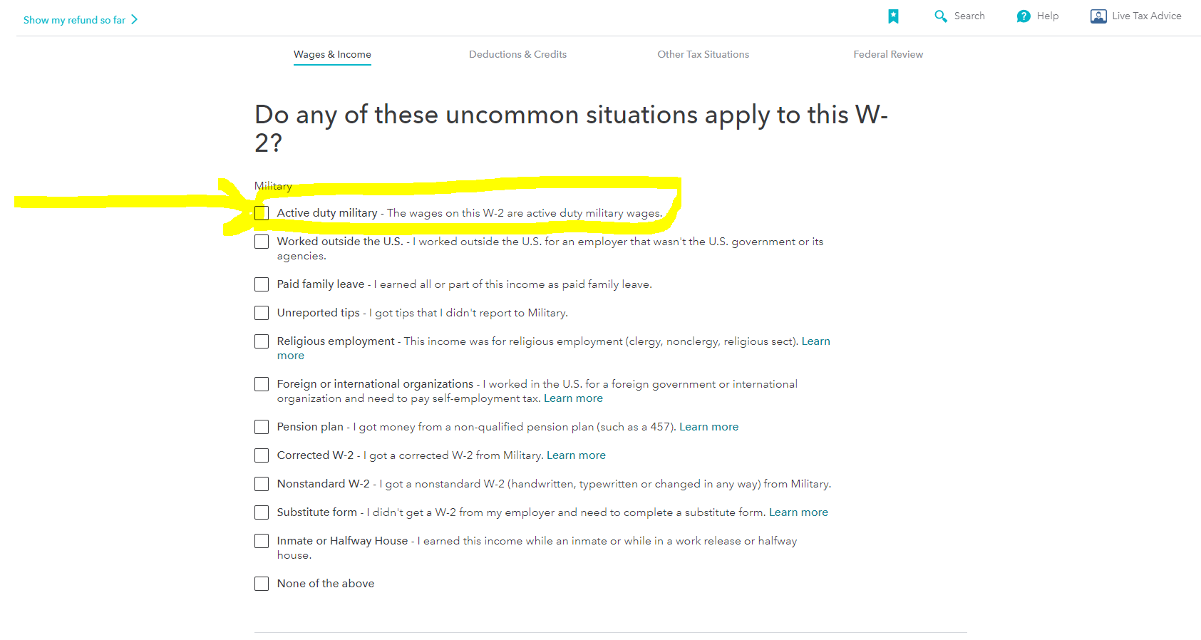 After you entered your W-2, did you continue through the interview and click the box for "Active duty military"