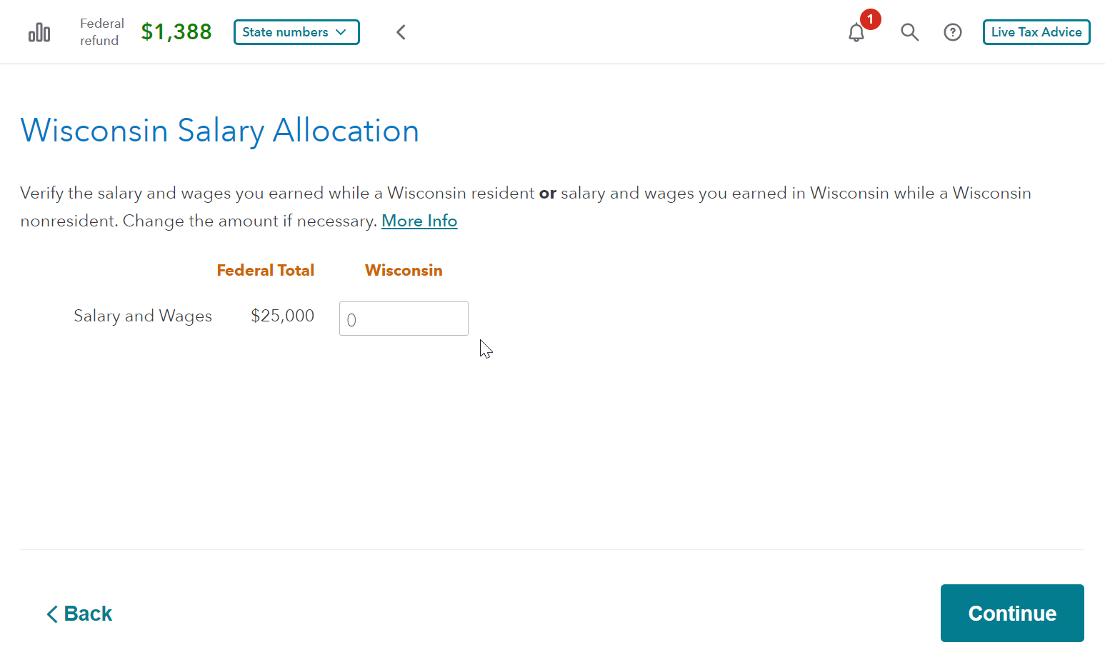 On the screen “Wisconsin Salary Allocation,” enter $0 for Wisconsin.