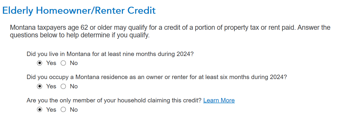 In regards to the Montana Elderly Homeowner/Renter Credit, TurboTax calculates this credit automatically based on the date of birth entered in the return, as well as the selections on the Elderly Homeowner/Renter Credit screen (see screenshot below). I did not have any issues toggling between the Yes and No options.