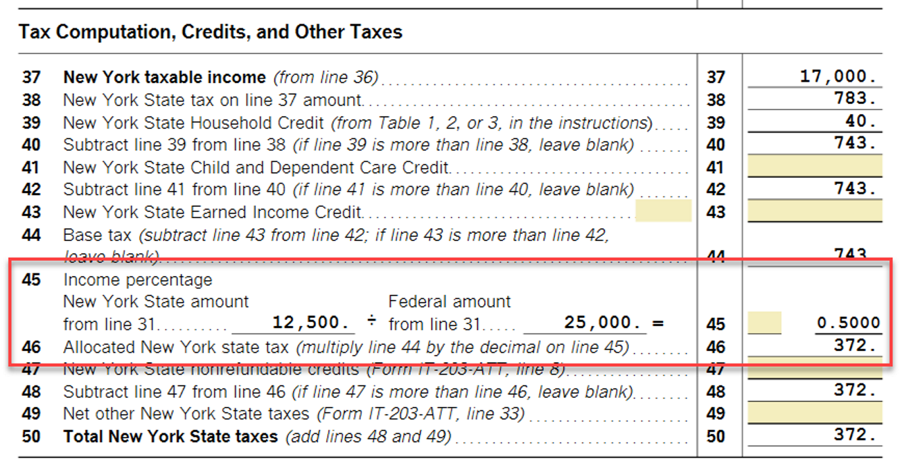 On line 31 there are two figures for New York adjusted gross income, the federal amount in the first column and the New York amount in the second column. Line 45 calculates the New York amount as a percentage of the federal amount. That's the "income percentage." The hypothetical tax on line 44 (the form calls it "base tax") is then multiplied by that percentage to determine the actual "allocated" tax on line 46.