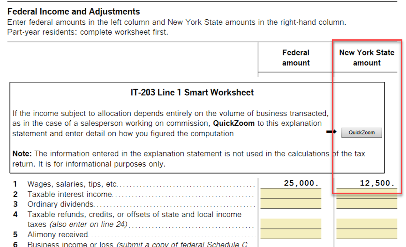 The first page of New York Form IT-203 has two columns for income. The first column is federal amounts, and the second column is New York amounts. The federal amounts on lines 1 through 19 should be the same as on your federal tax return, and include all your income. The New York column should not include the income that you earned when you were living and working in New Jersey.