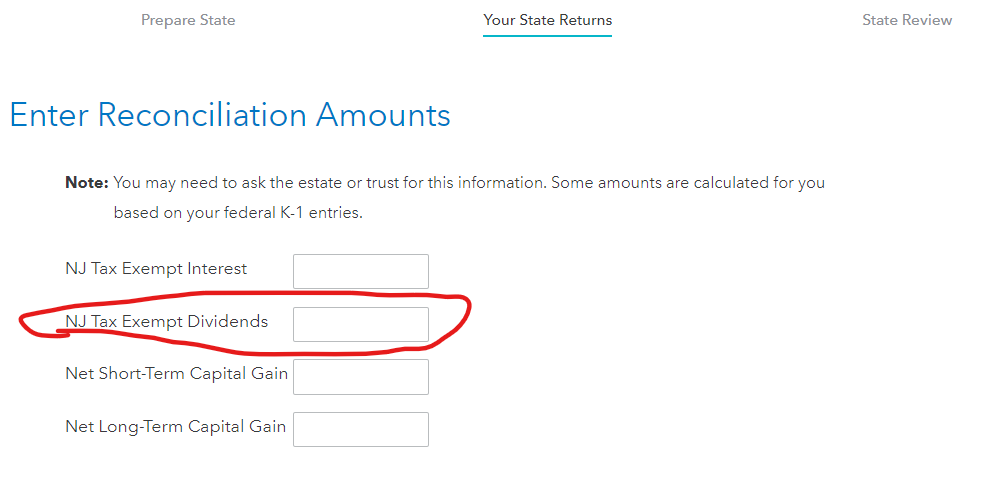 @FangxiaL Unfortunately Turbotax Premier on-line does not have an Enter Reconciliation Amounts screen, nor an applicable Adjustments section in the NJ return. It does have a Exempt-Interest Dividends screen in the Federal Wages and Interest section under 1099-Dividends. In that screen I entered the NJ tax-exempt amount, and the Multiple States tax-exempt amount. Both amounts when added equal 1099-DIV box 11 (exempt-interest dividends) amount. Unfortunately those values don't transfer over to the NJ tax return section. In the NJ section there is a Dividend income screen but you can only check the amounts, not adjust them. Also, there is an Other Non-wage Income screen in NJ return but that doesn't seem applicable since all the amounts were listed in Federal section. This same problem occurred with 2020 Turbotax Premier, but not prior year before that. I really would like ti finish my taxes, but this problem is holding it up. Please how can this be fixed?
