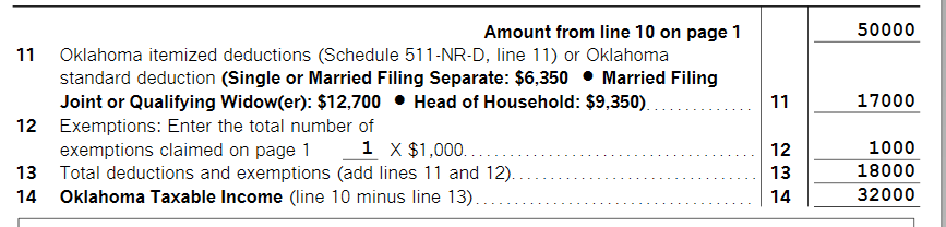 The formula for income taxed by both jurisdictions is your Oklahoma wages less your Oklahoma itemized deductions less your Oklahoma exemptions. This is on Line 11 and Line 12 of your Form 511NR, respectively.