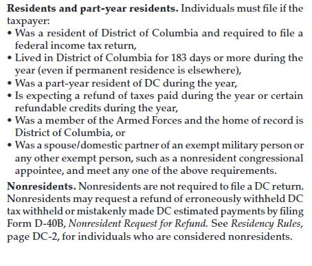 District of Columbia filing requirements are here. Source The TaxBook, page DC-1
