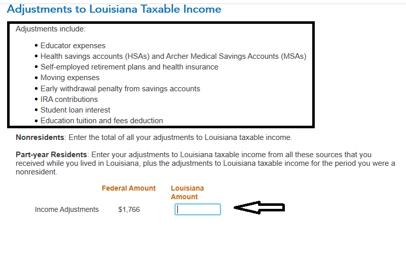 There is a list of adjustments available on the screen. If any of those apply to your LA income, add them together and put them in the box.
