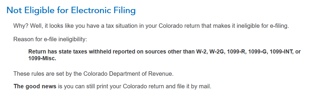 Here's the error I get around electronic filing "Return has state taxes witheld reported on sources other than W-2, W-2G, 1099-R, 1099-G, 1099-INT, or 1099-Misc". I did report a small pension distribution in the amount of $178 that was reported on a 1099-R which, according to the error, should still allow me to file electronically.