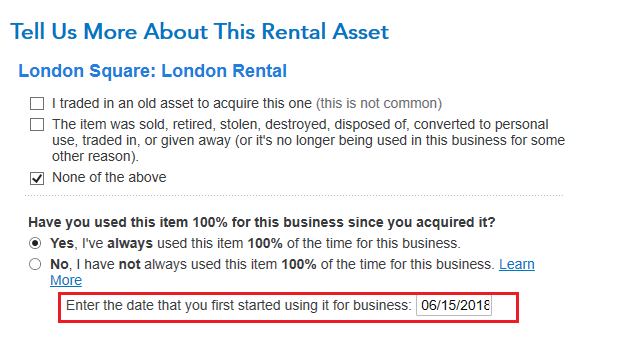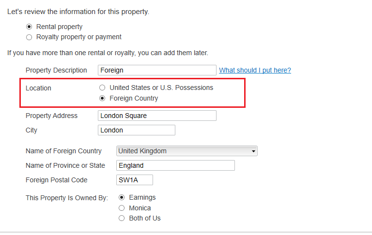 Follow the interview for the Rental Properties and Royalties. On the screen Is This a Rental Property or Royalty? select Rental Property. Indicate that the Location is a Foreign Country. Complete the page and continue. Follow the interview until you are on the screen Is Your Property in Any of These Designated Areas? Select Assets for this property are located outside of the United States or United States possessions and All of the assets for this property are located outside of the United States or United States possessions and continue.