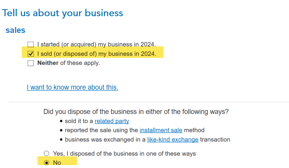 The best thing to do would be to enter the business section and indicate that you terminated the business and TurboTax may address issues that would affect you in 2024.