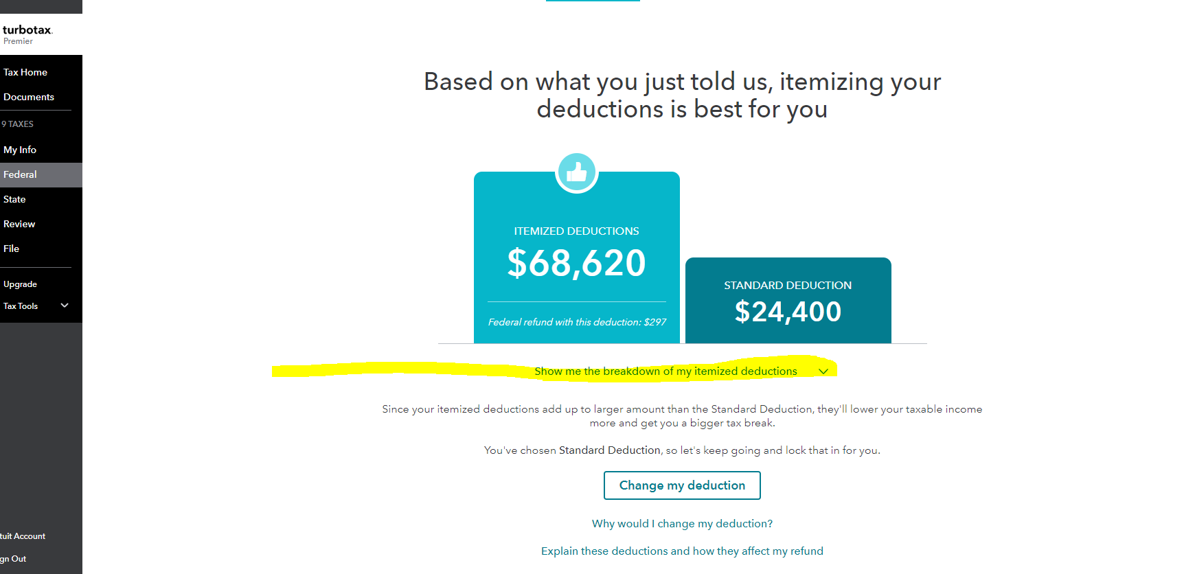 On the screen that tells you if Itemizing or the Standard deduction is best, click the "Show me the breakdown of my itemized deductions"