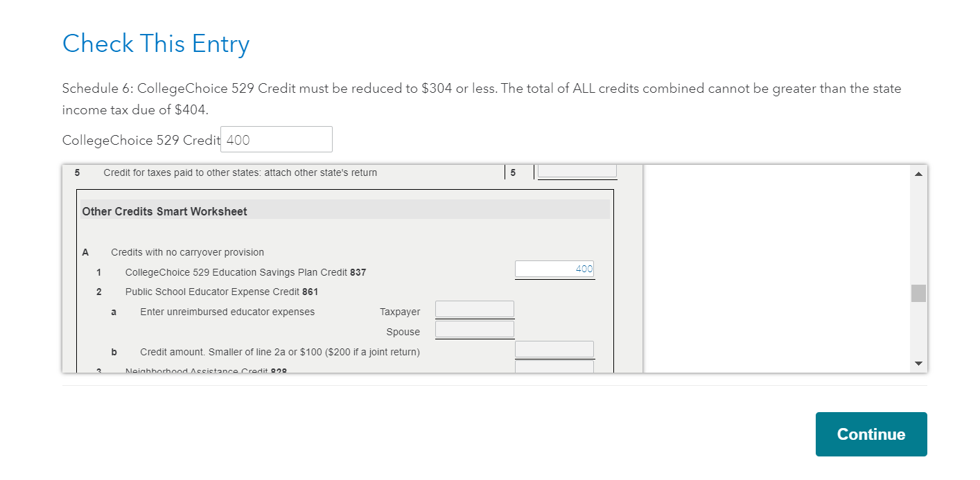 Schedule 6 of the IT-40 states that the credits of Lines 4 through 7 cannot exceed the the state adjusted gross income tax stated on line 8 of IT-40. Here appears to be the problem that I'm experiencing. My two tax credits (i.e., college contribution credit and the 529 plan contribution credit) slightly exceeded the state adjusted gross income tax amount on Line 8 of IT-40. Since the total credits exceeded the state adjusted gross income tax; TurboTax used the college contribution credit ONLY and completely ignored ALL or any portion of the 529 contribution credit. It appears that the program should have allowed a portion of the 529 contribution credit up to, but not exceeding the amount of tax on line 8 of IT-40 (after subtracting the $100 for the college contribution credit). By ignoring all of the 529 tax credit as opposed to just the necessary portion needed; it amounted to an additional state tax owed of $384 in my given situation. For example, if I showed that I contributed $2,000, TurboTax stated that I still owed $444 in taxes. I found that if I entered a lesser 529 contribution amount of $1,922 ($1,922 x 20% tax credit= $384), TurboTax stated I owed only $60 in additional state income tax. Is this right? Thanks, Steve