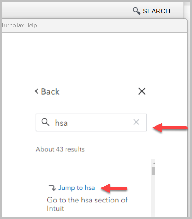 To search for your HSA entries in TurboTax, you can type "HSA" in your search box. It will look something like this: