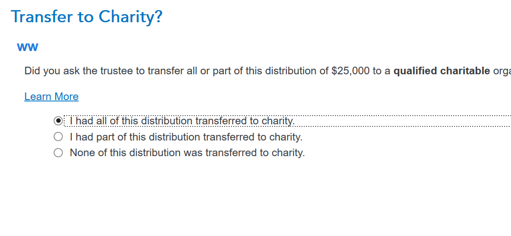 As you continue with the interview screens, you will be asked if you donated a portion or all of the distribution to charity. There are eligibility requirements. TurboTax will exclude this amount and will show the notation QCD.