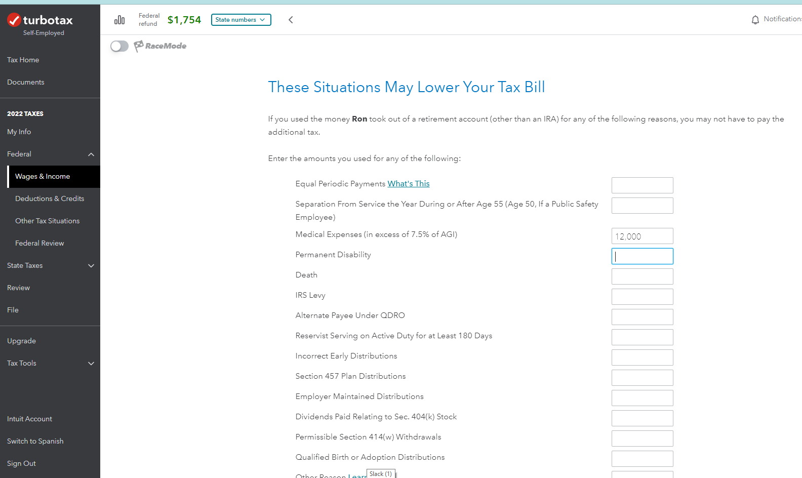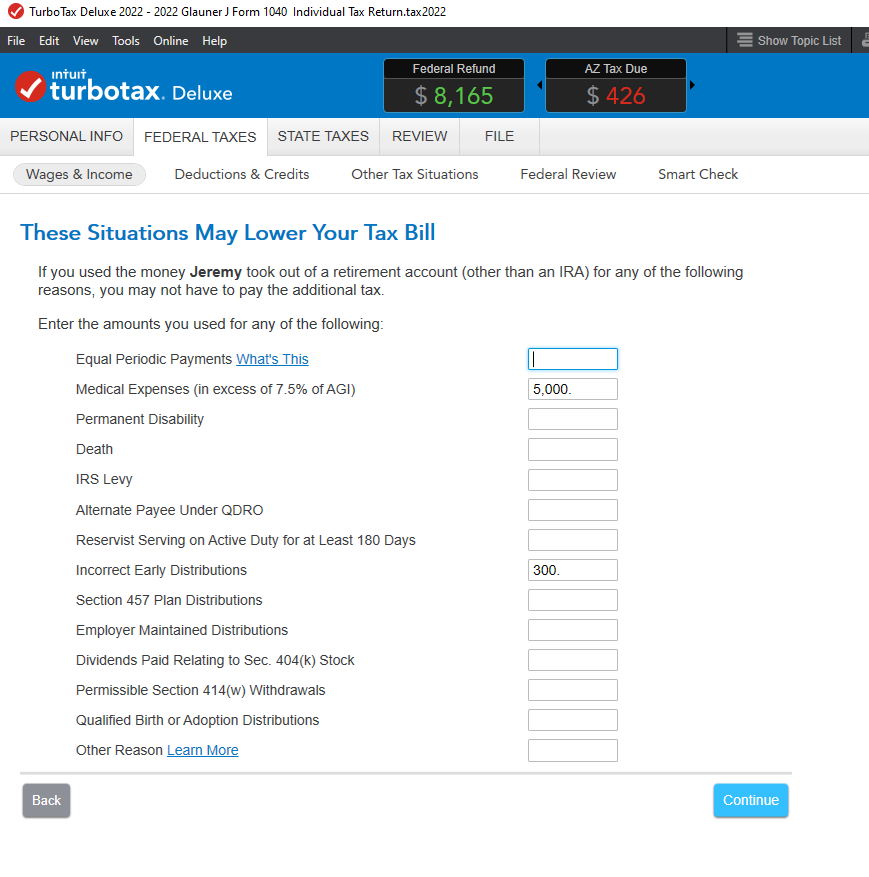 Exceptions to the Early Withdrawal Penalty for Medical Expenses is entered on Form 5329, Line 1E. Make sure you have already entered your Medical Expenses.