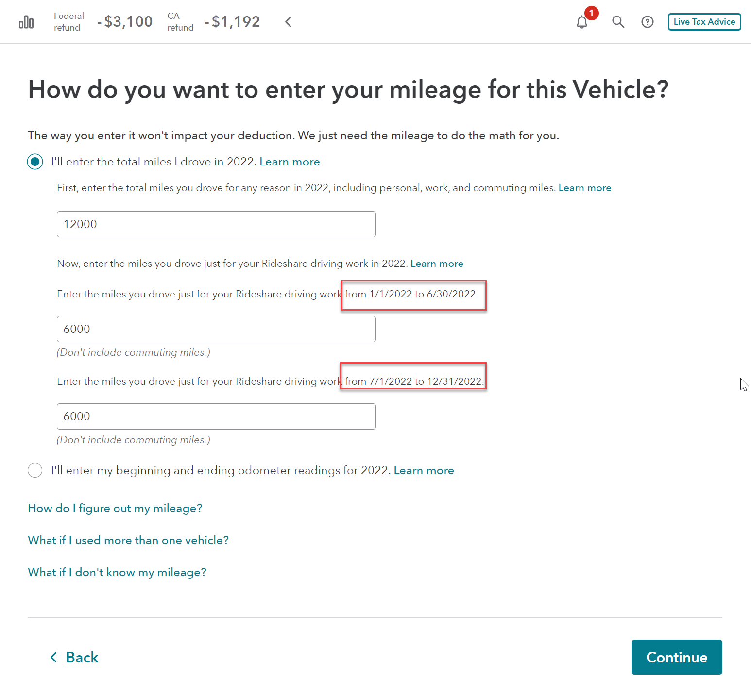 You are allowed to claim all of your business use mileage regardless of when you started your business in 2022. Try entering a zero for miles in the first part of the year. I am not getting your message.